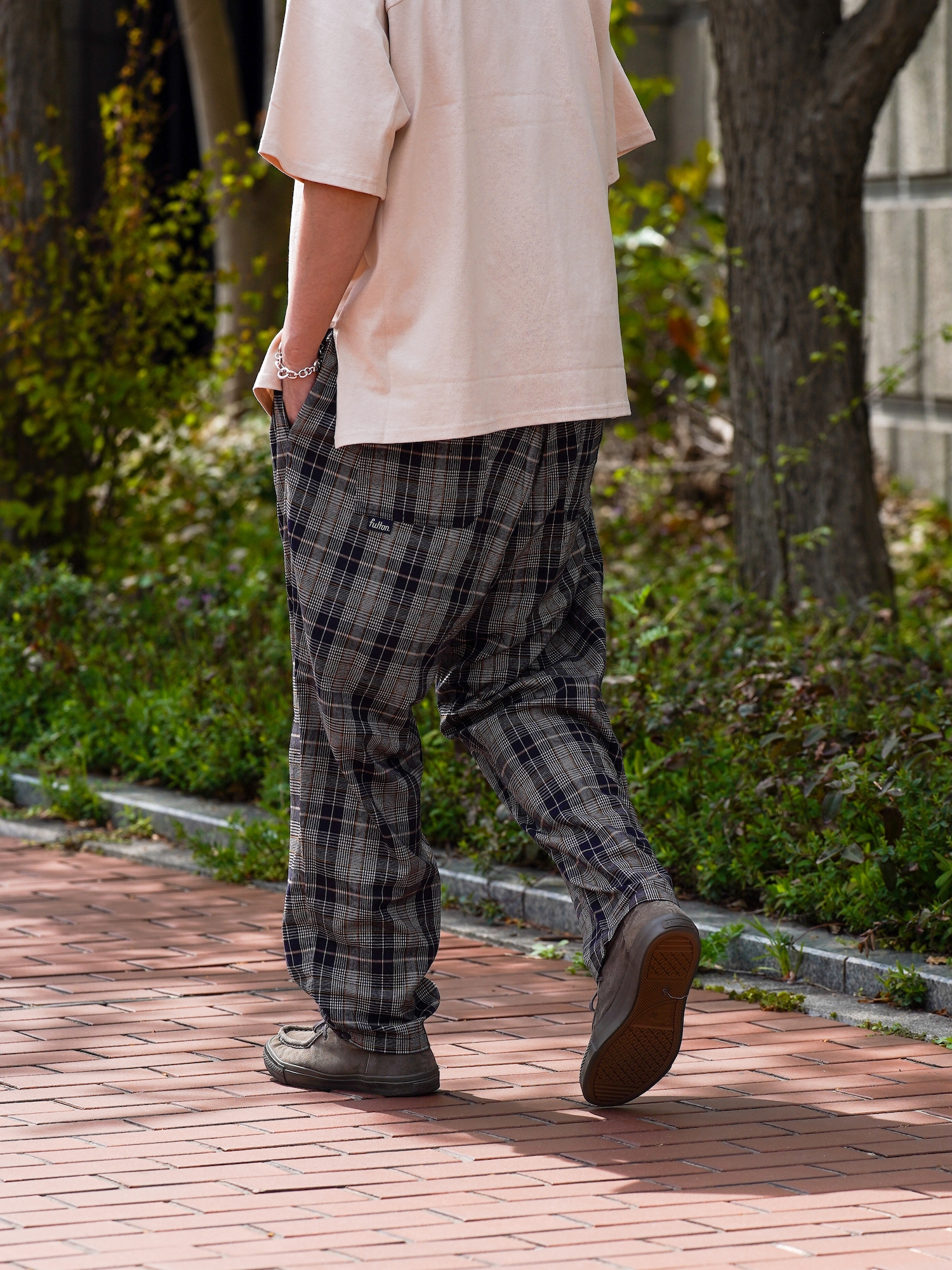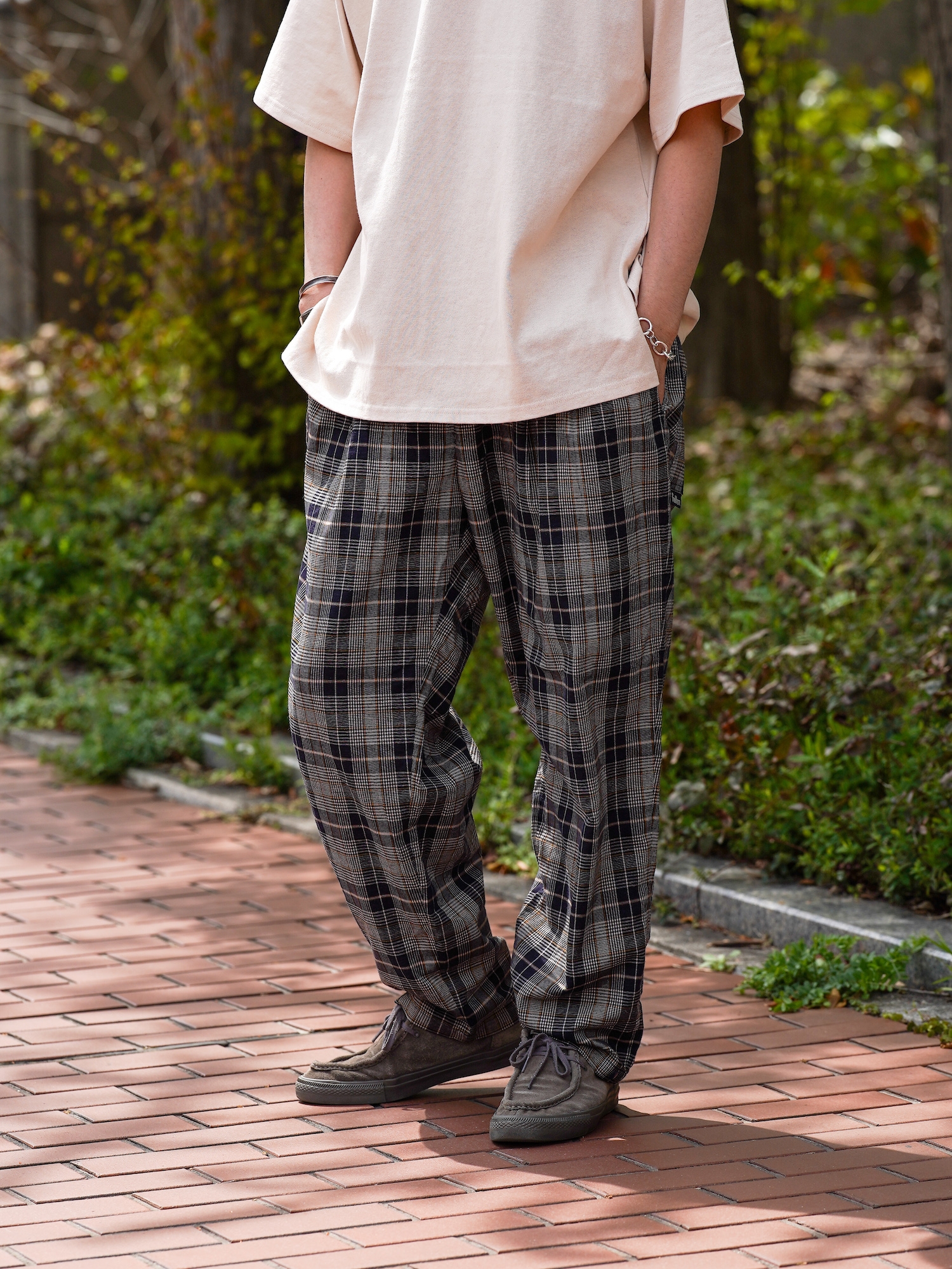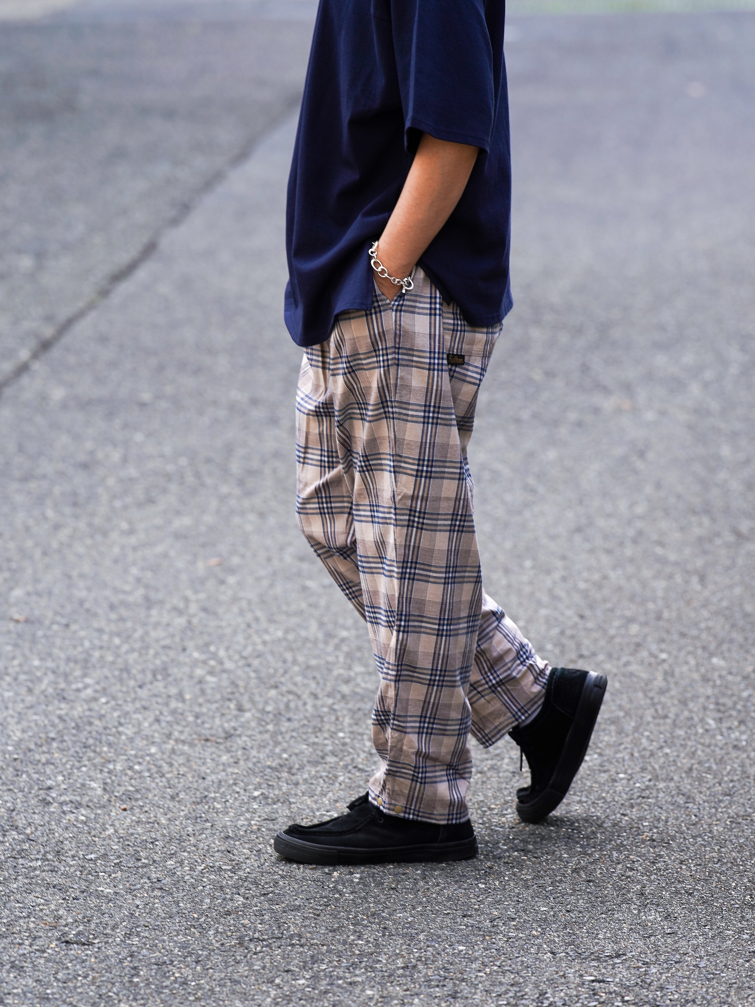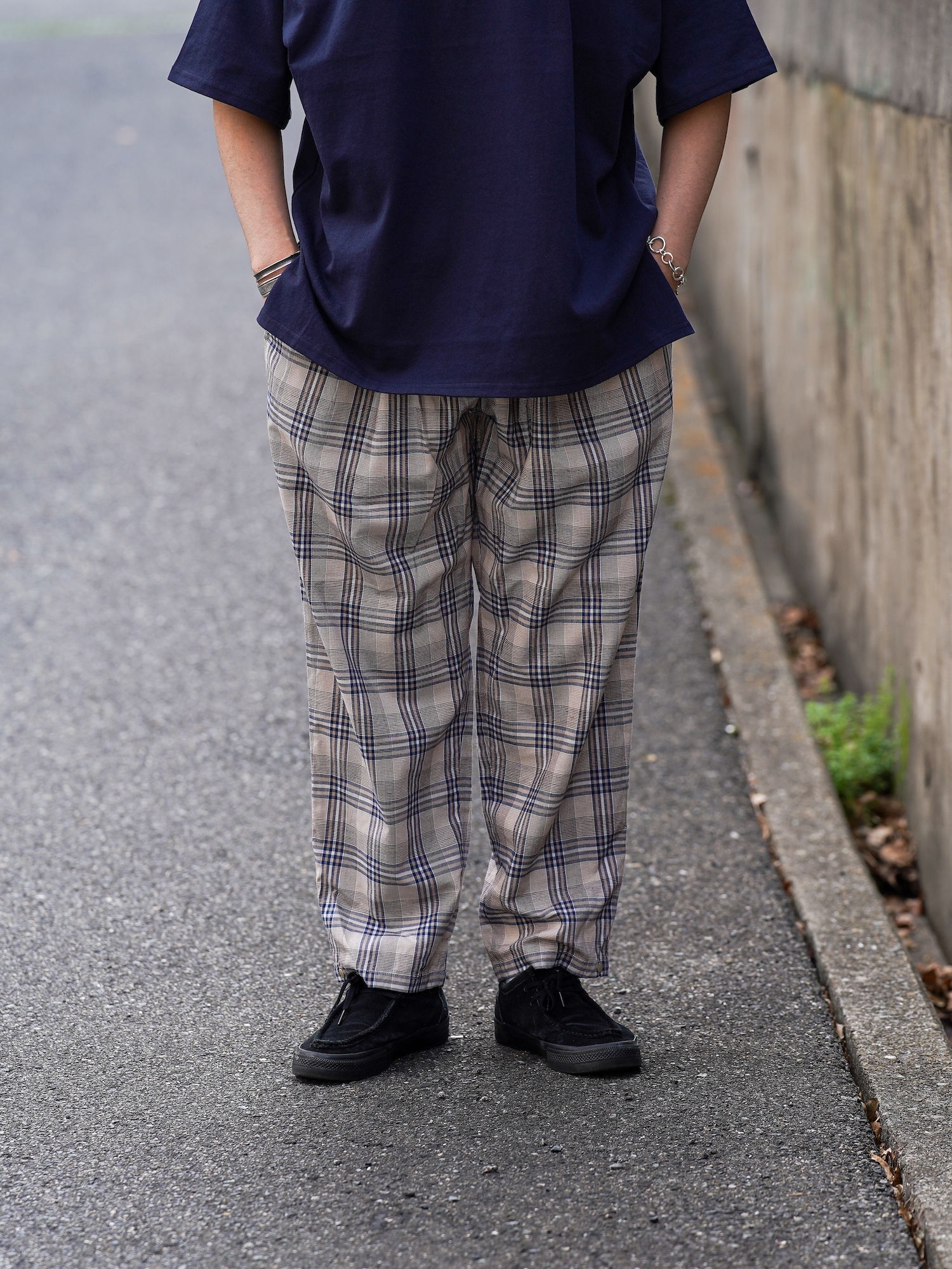 紐とゴムを配したイージータイプのウエストに、太すぎず良き塩梅のワイドなシルエットで、リラックスを最優先したデザイン。