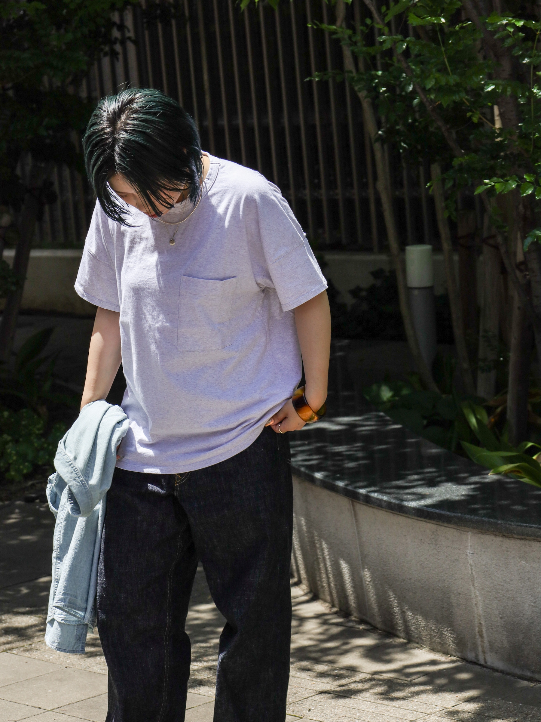首元から袖口までのゆき丈は通常のTシャツの長さのままゆるやかなドロップショルダーとなっていて、