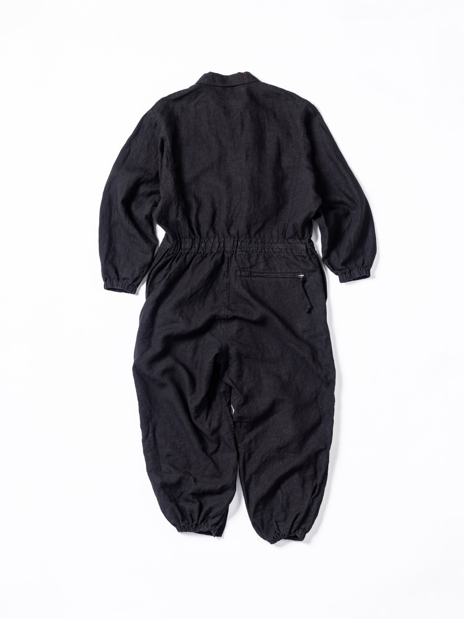 腰元と袖・裾はゴムで絞られておりメリハリがあるので一枚で着ることはもちろん、上半身を下ろして腰元で絞ったり、アウターを重ねたりと、様々にアレンジが効くのもツナギのいいところですよね。