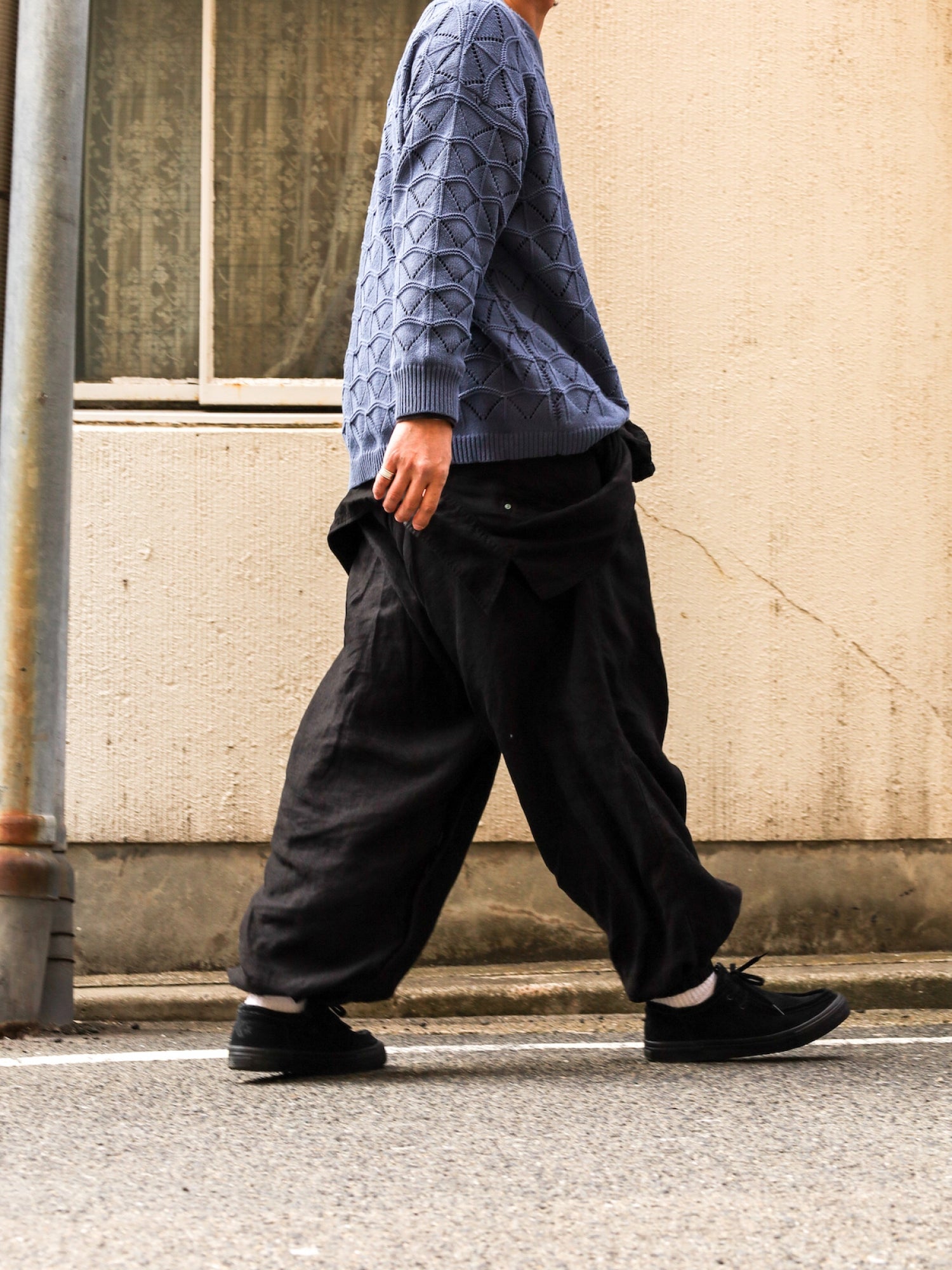 ゆとりのあるシルエット感で冬場はスエットパンツやニットの上から着用して頂けます。