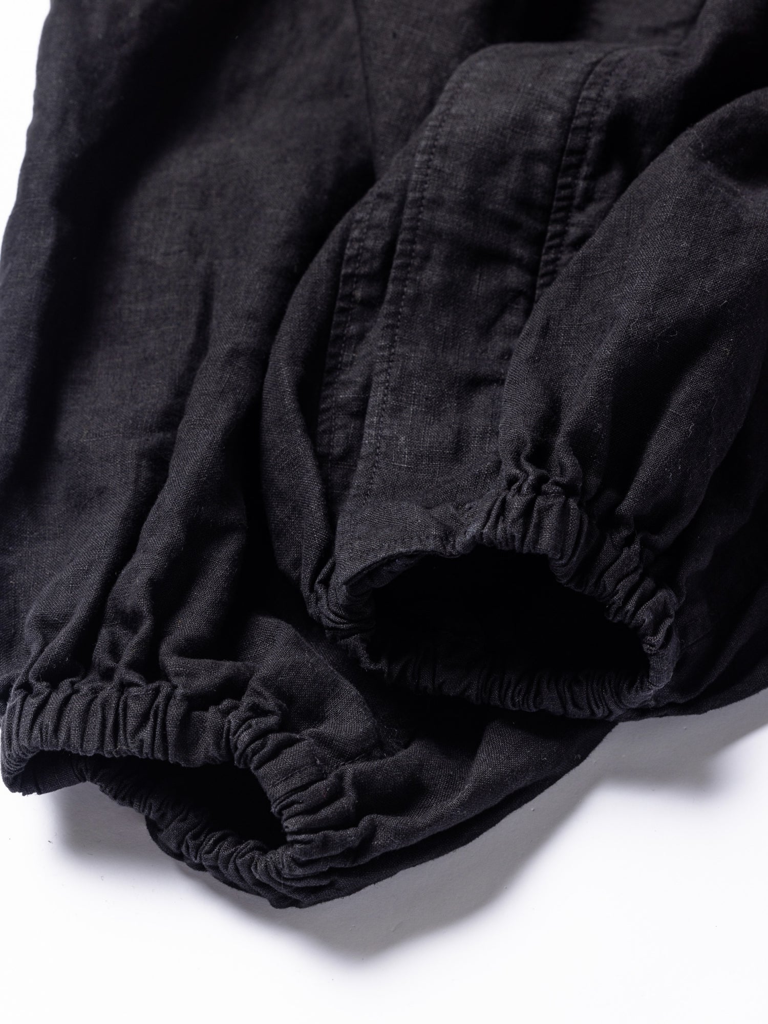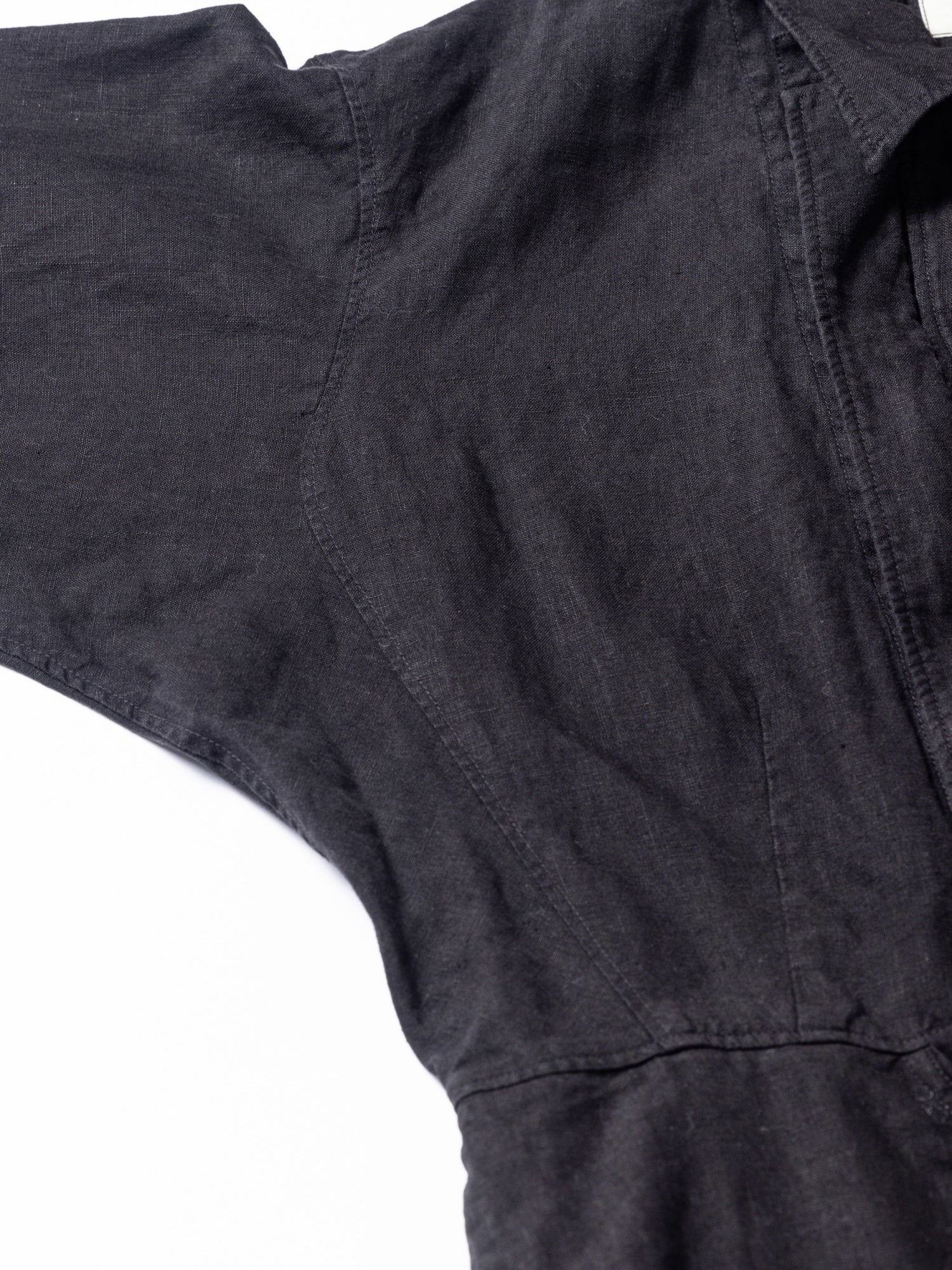 本作では太番手のムラネップリネンが用いられており、通常は硬めの風合いとなる織りの規格ですが、柔らかさを増す仕上げによりリネンならではの適度にコシとハリがある生地感になっています。