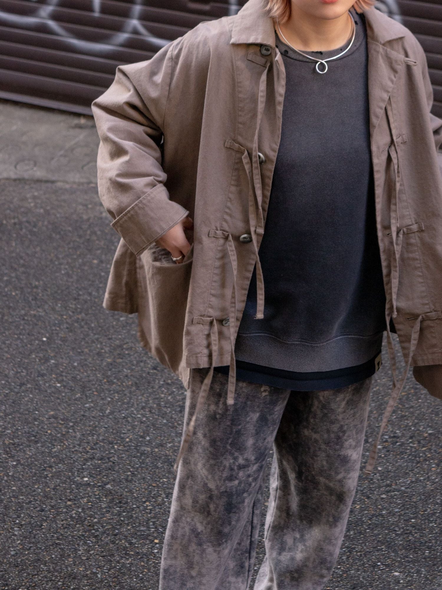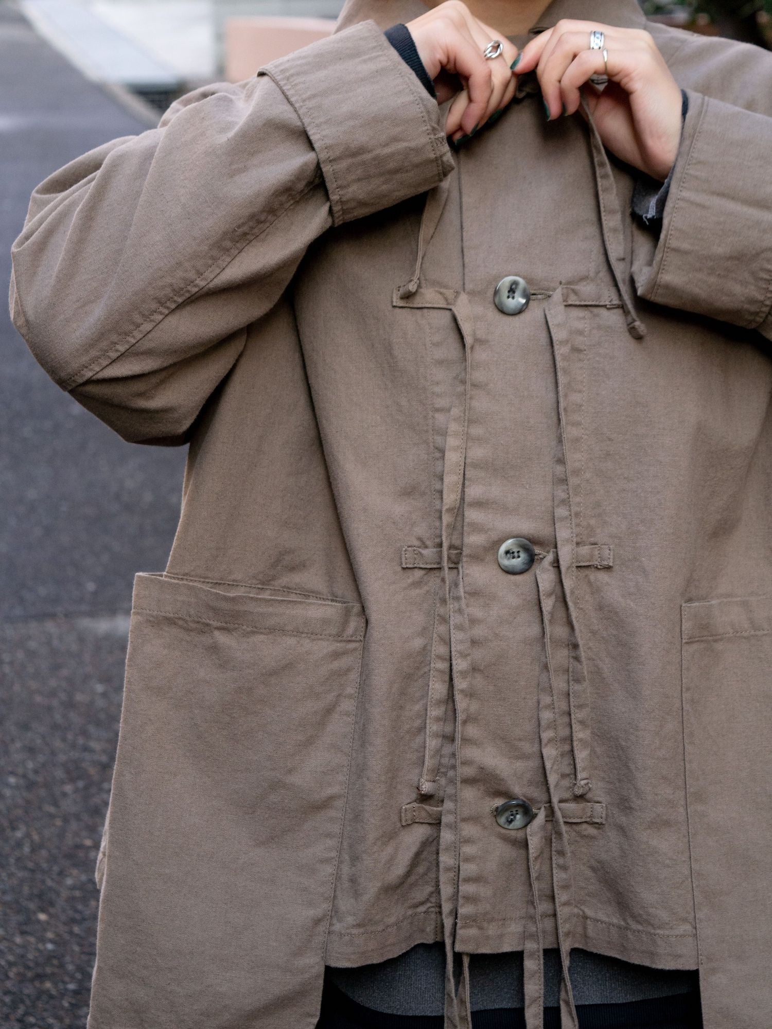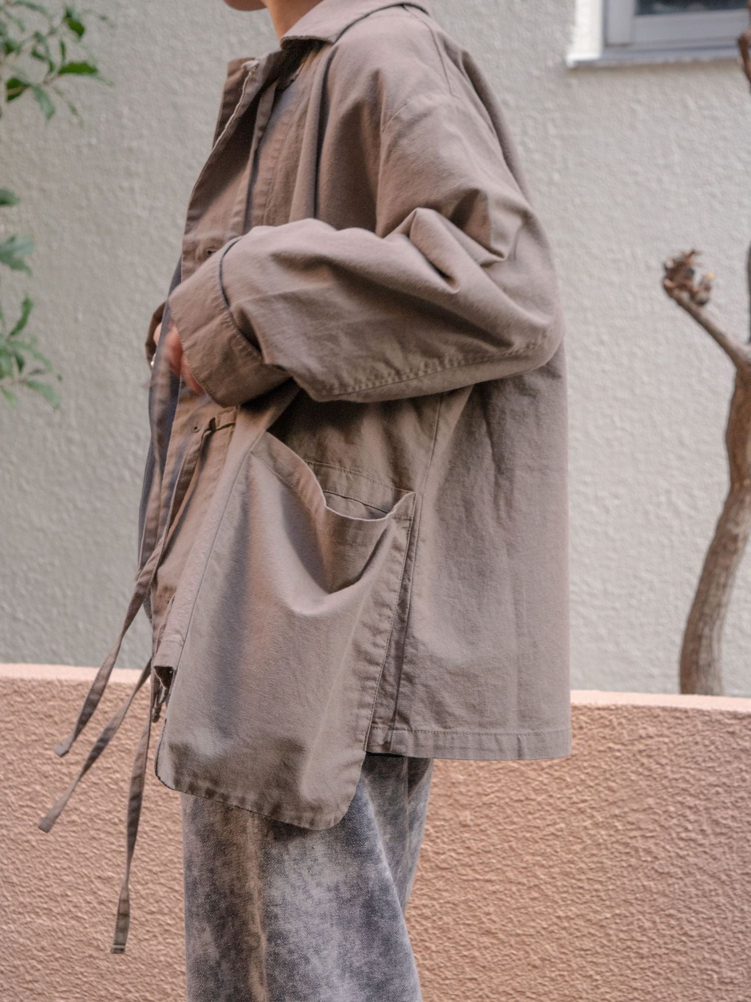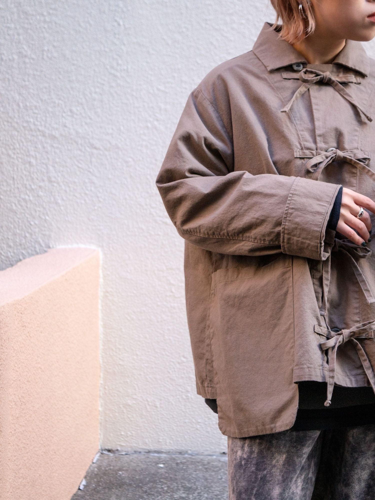 ヒモを垂らしてデザインジャケットとしてのビジュアルも良し、結んでカンフージャケット感を醸しても良し、唯一無二なディテールたちが着用時の素晴らしい表情を生むポイントですよね。