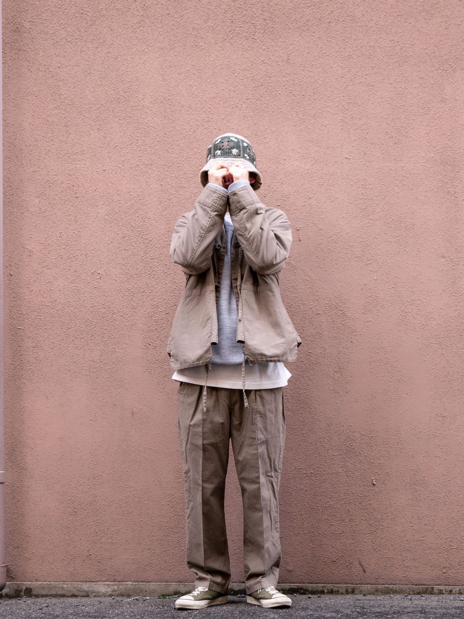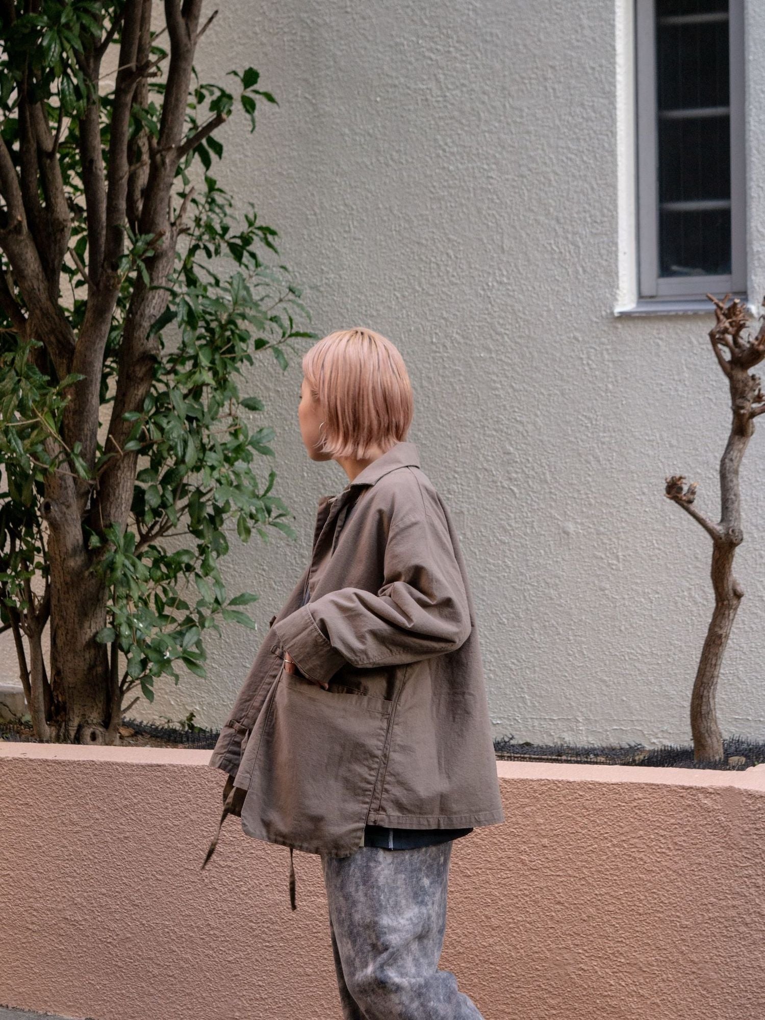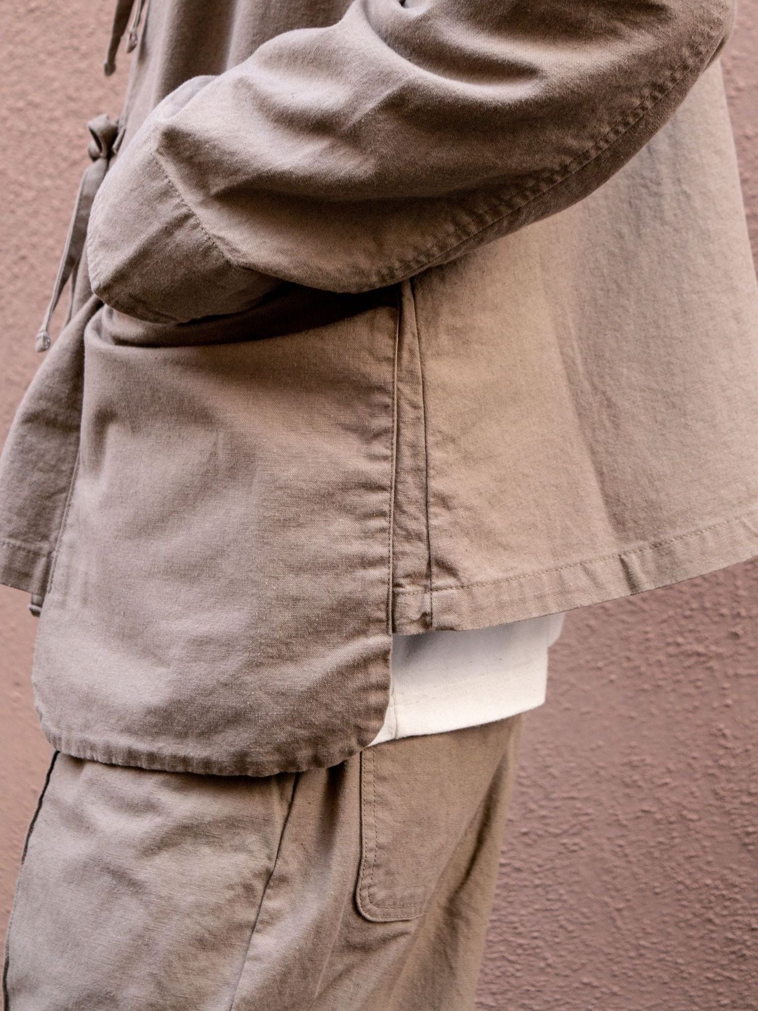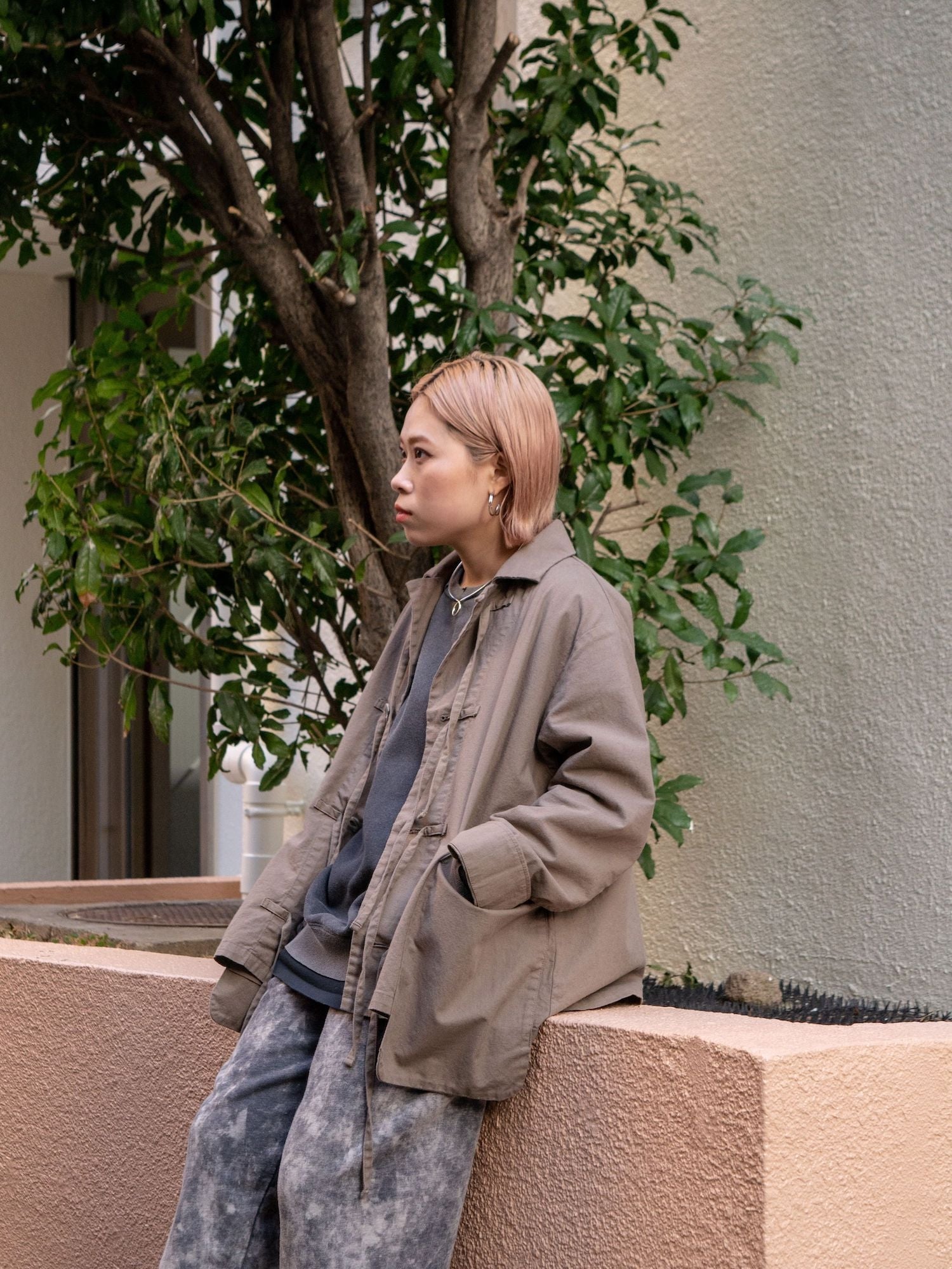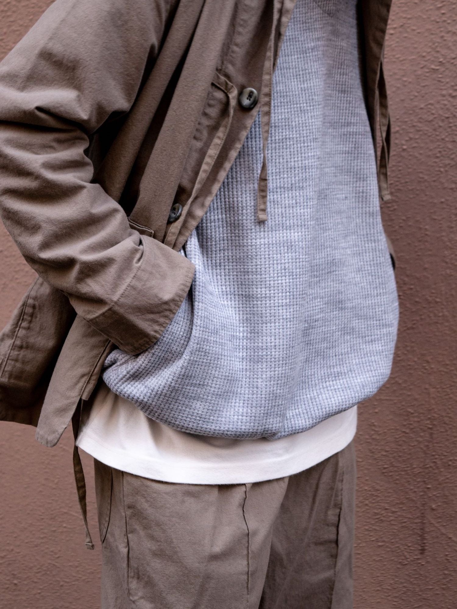 ヒモを垂らしてデザインジャケットとしてのビジュアルも良し、結んでカンフージャケット感を醸しても良し、唯一無二なディテールたちが着用時の素晴らしい表情を生むポイントですよね。