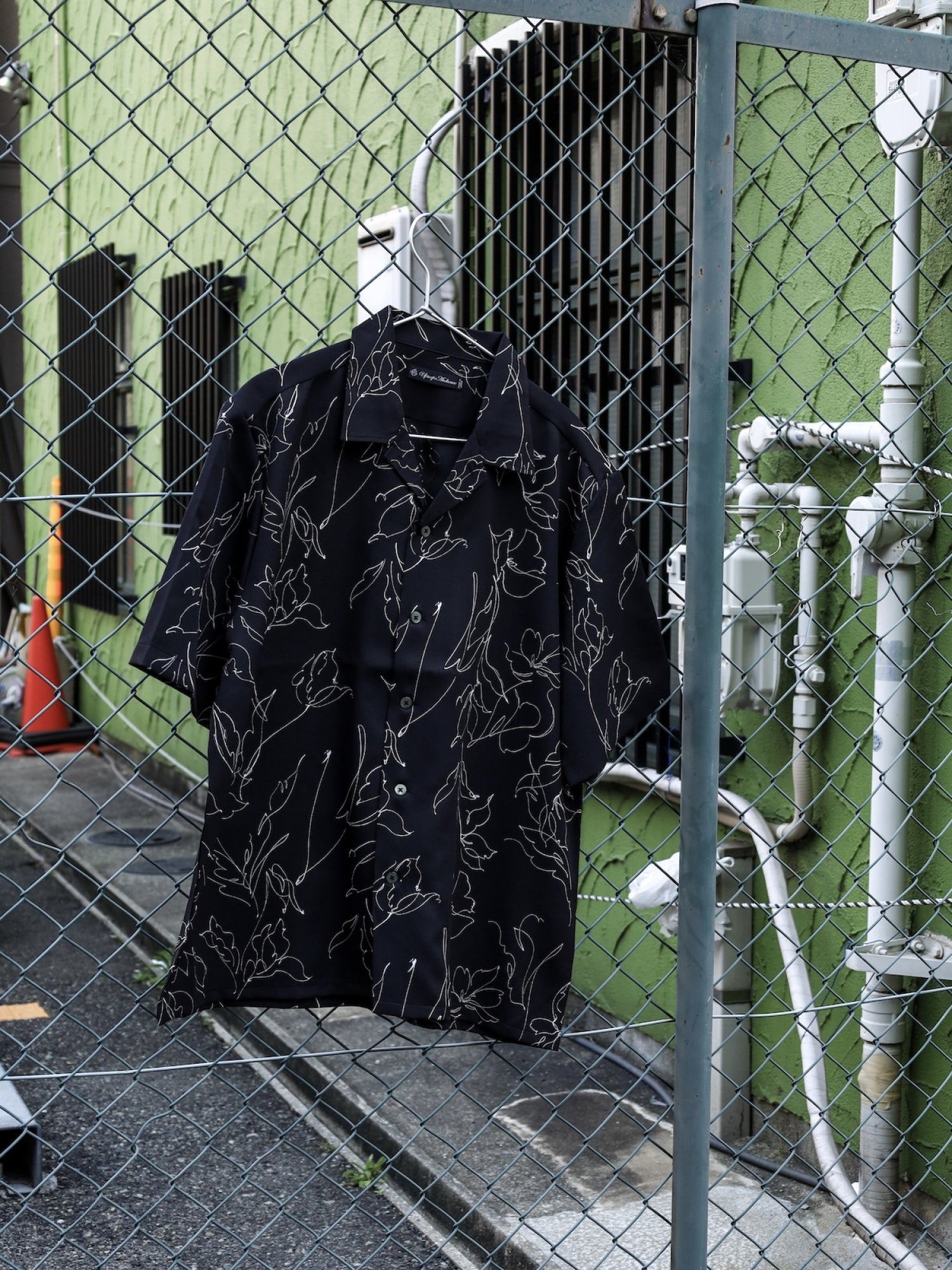 「丹後」 ライトアムンゼン(梨地) 捺染 モノトーンフラワー “マシンプリント” 開襟シャツ / Black