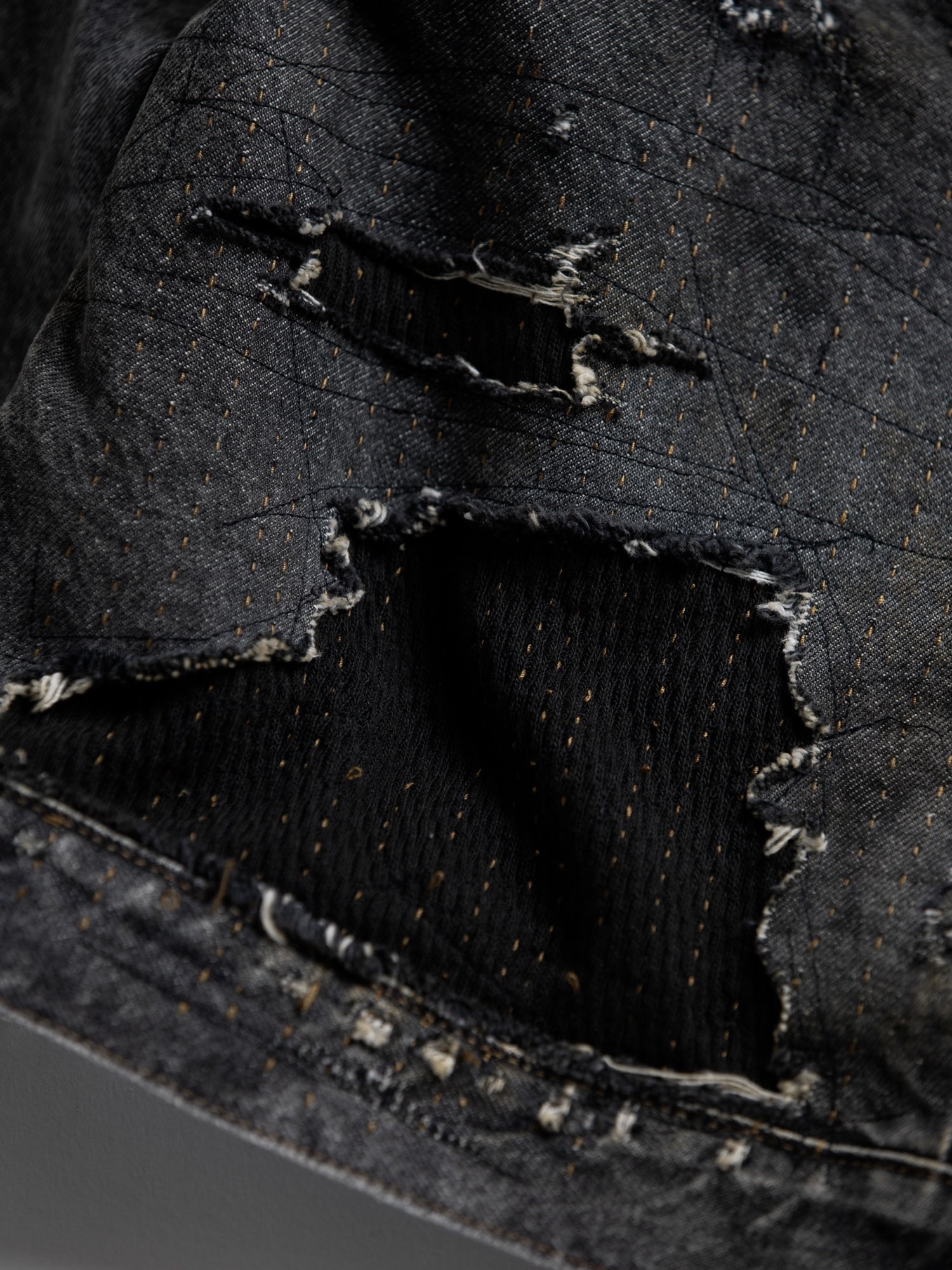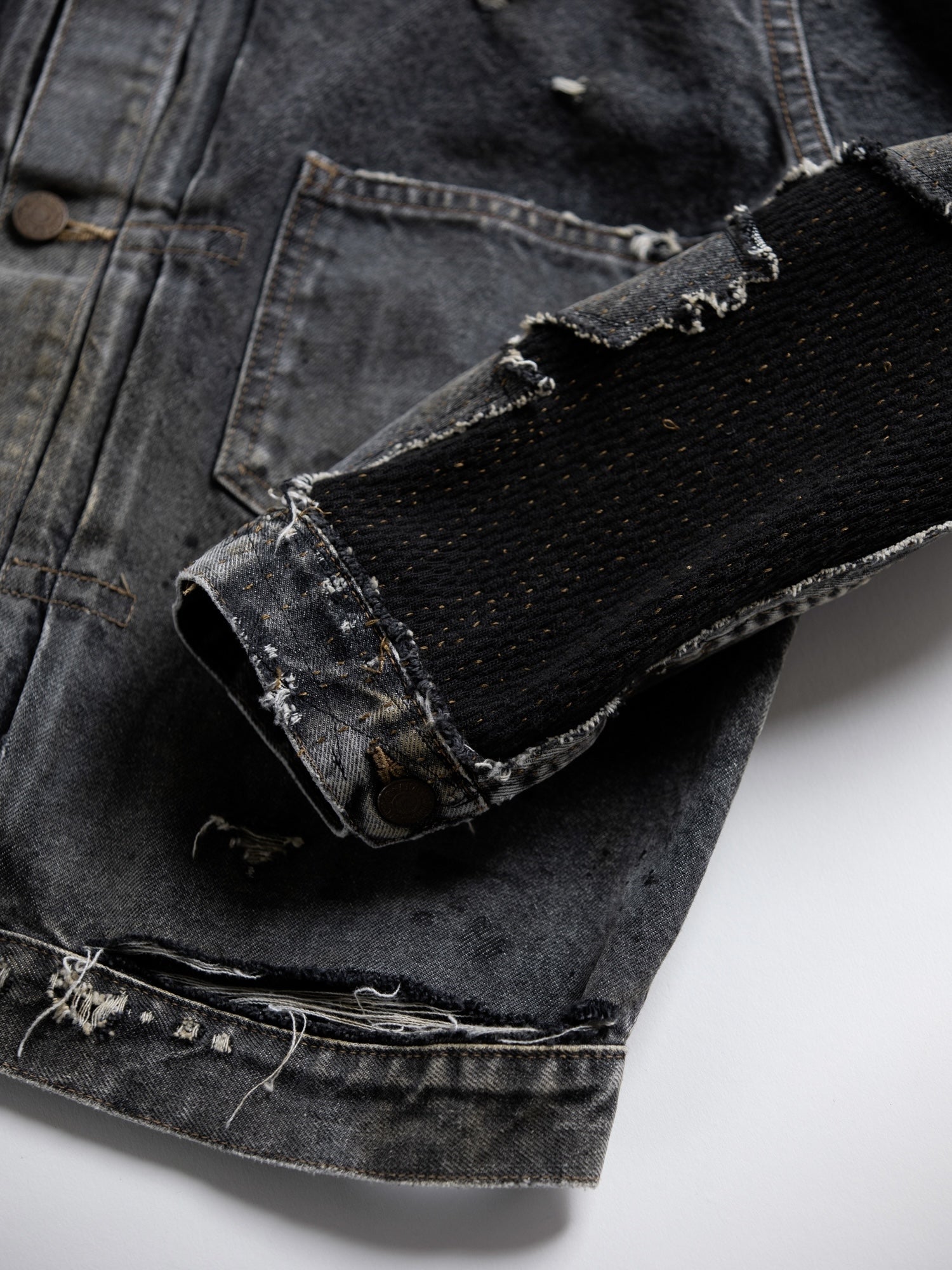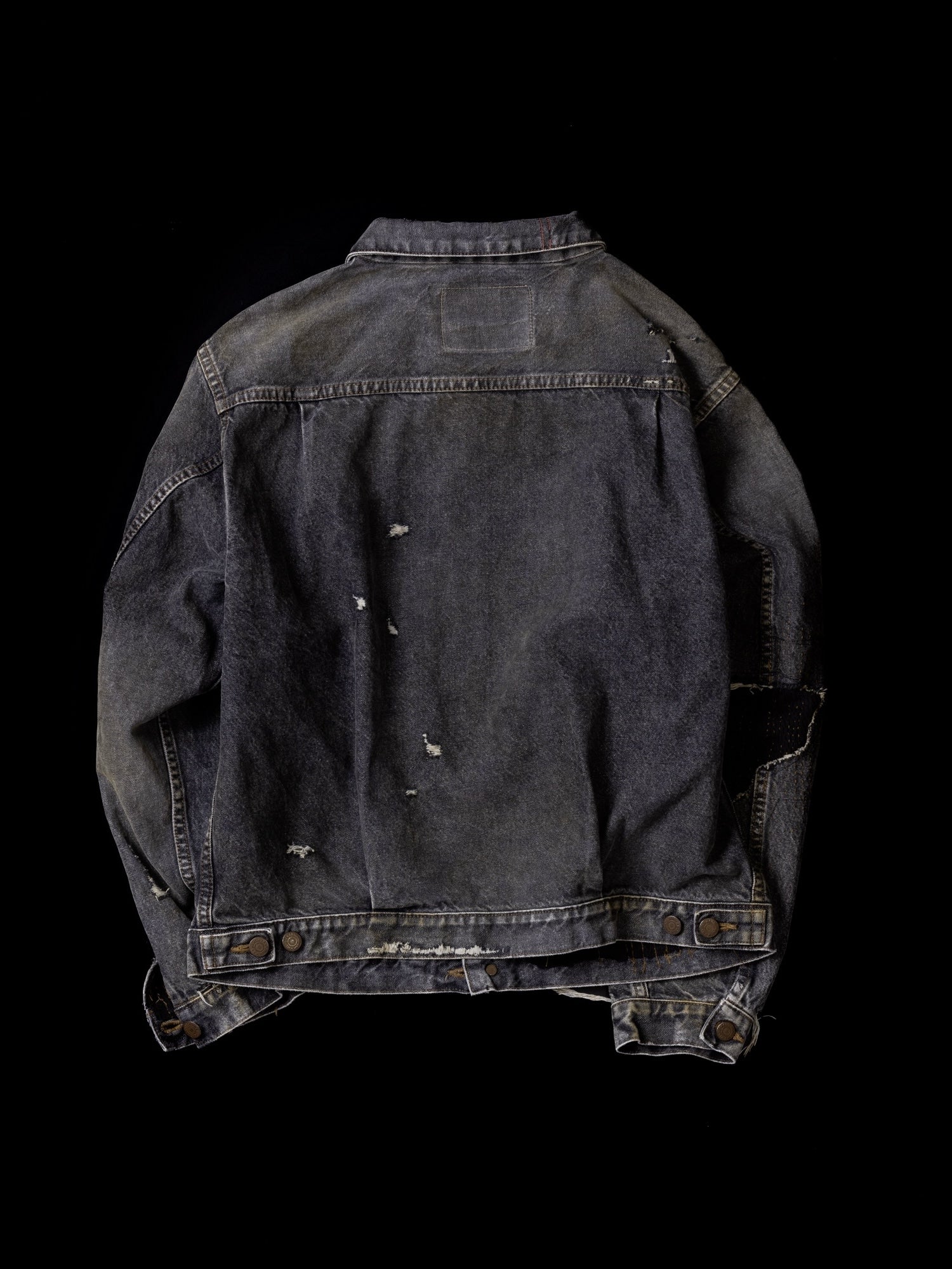まず全体的にエイジング加工を行った生地をベースに、その後、裾・袖を中心にハードなダメージを敢行。