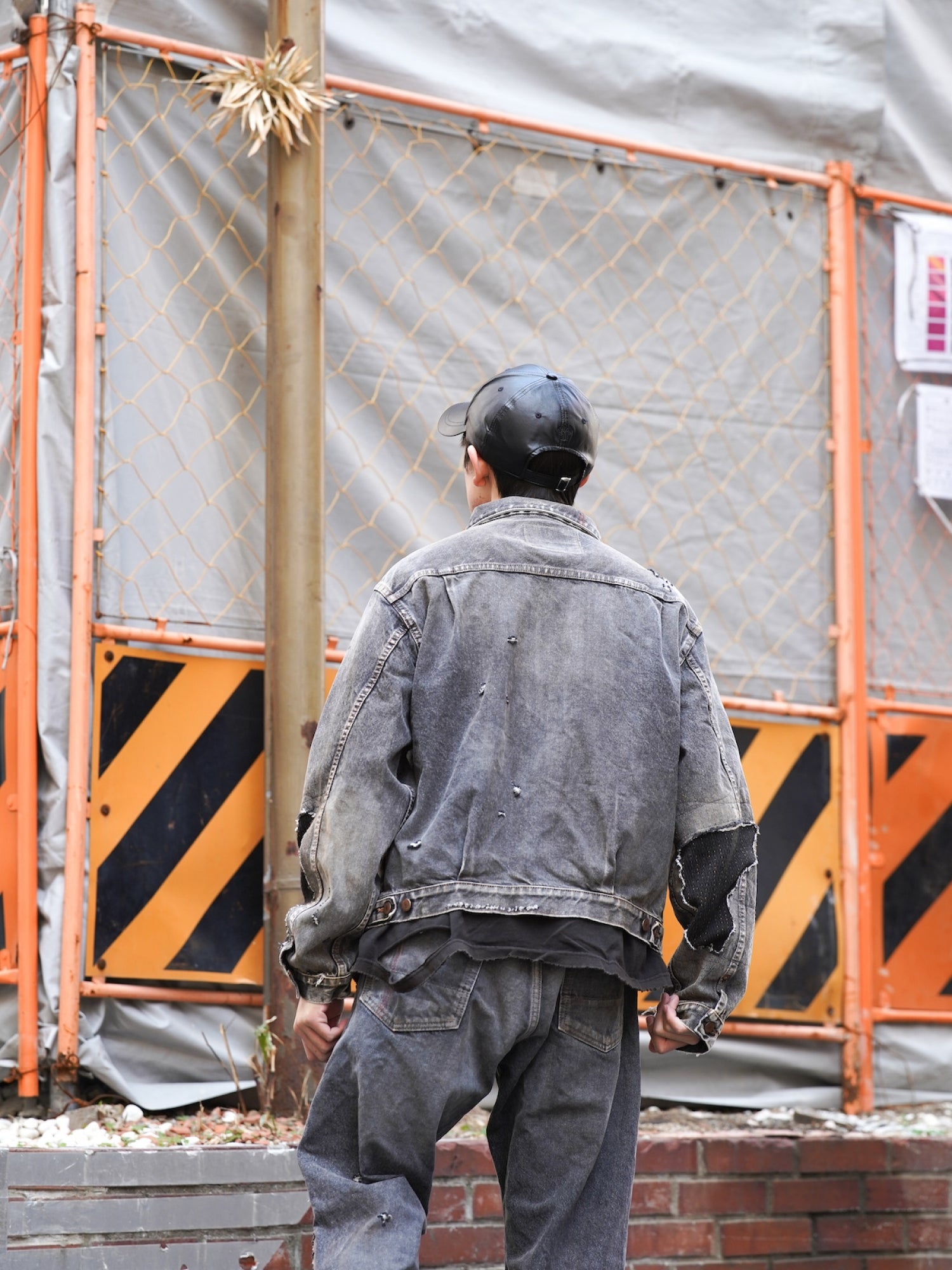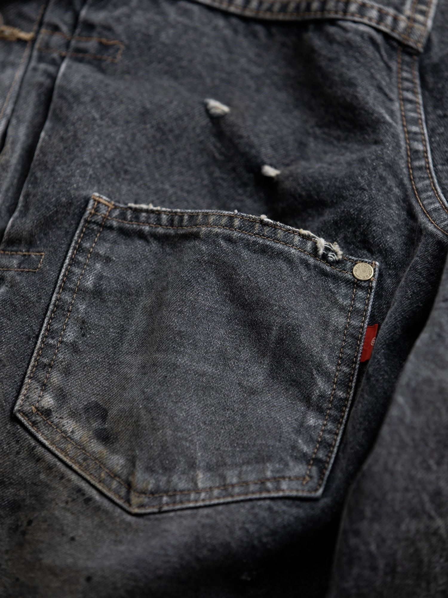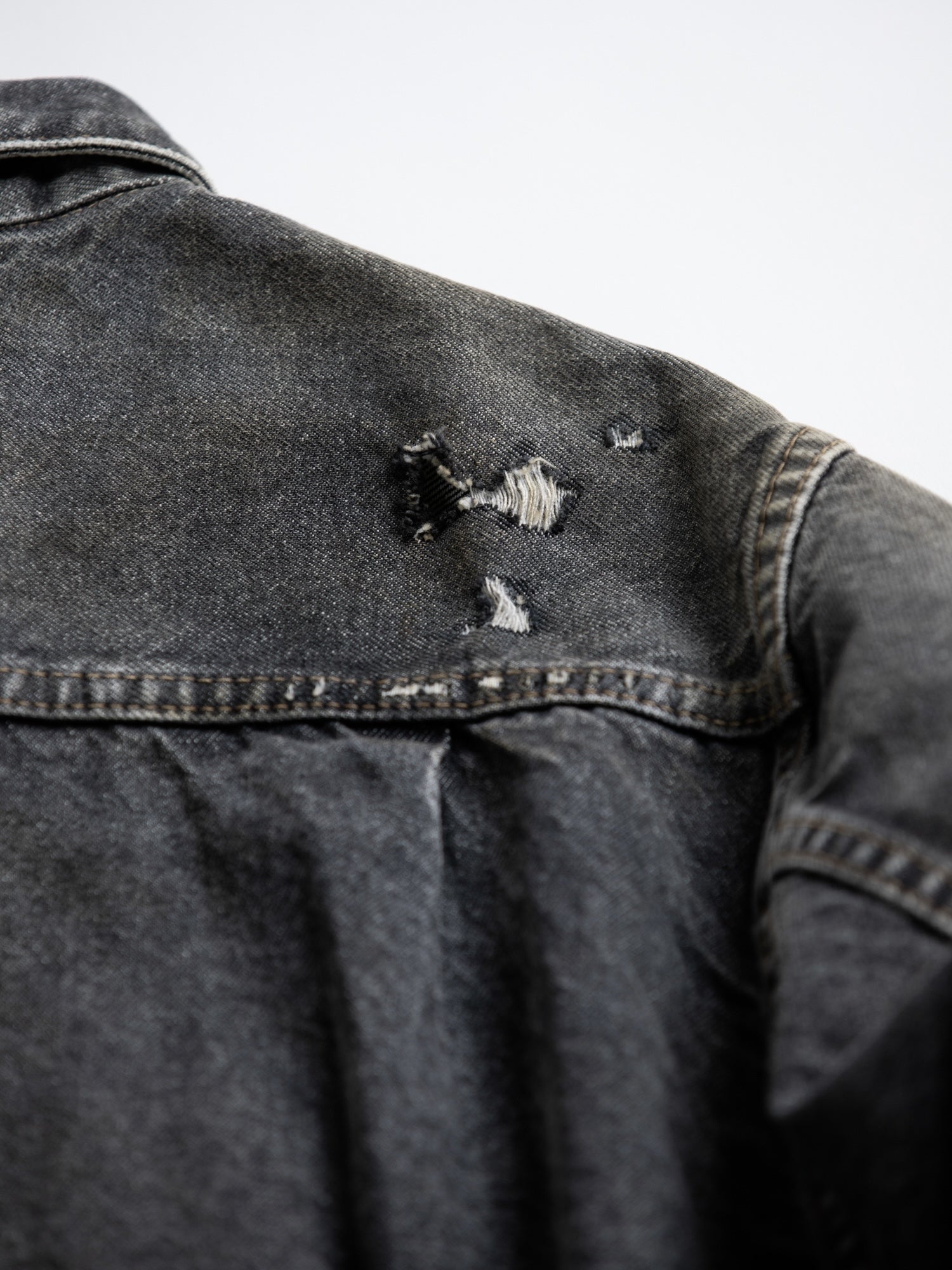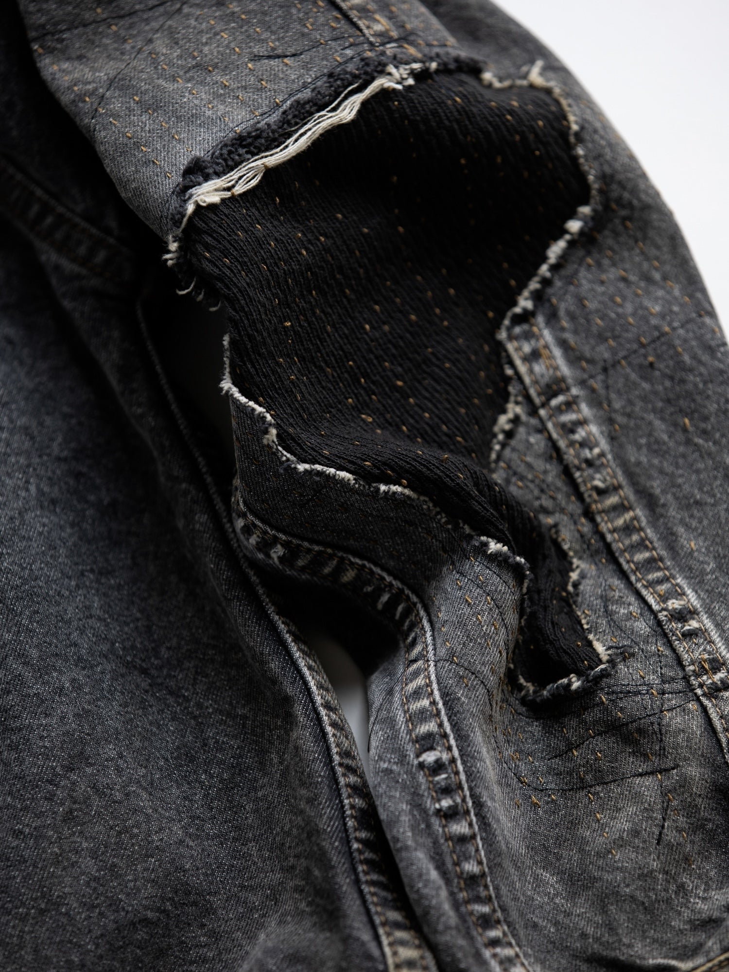 まず全体的にエイジング加工を行った生地をベースに、その後、裾・袖を中心にハードなダメージを敢行。