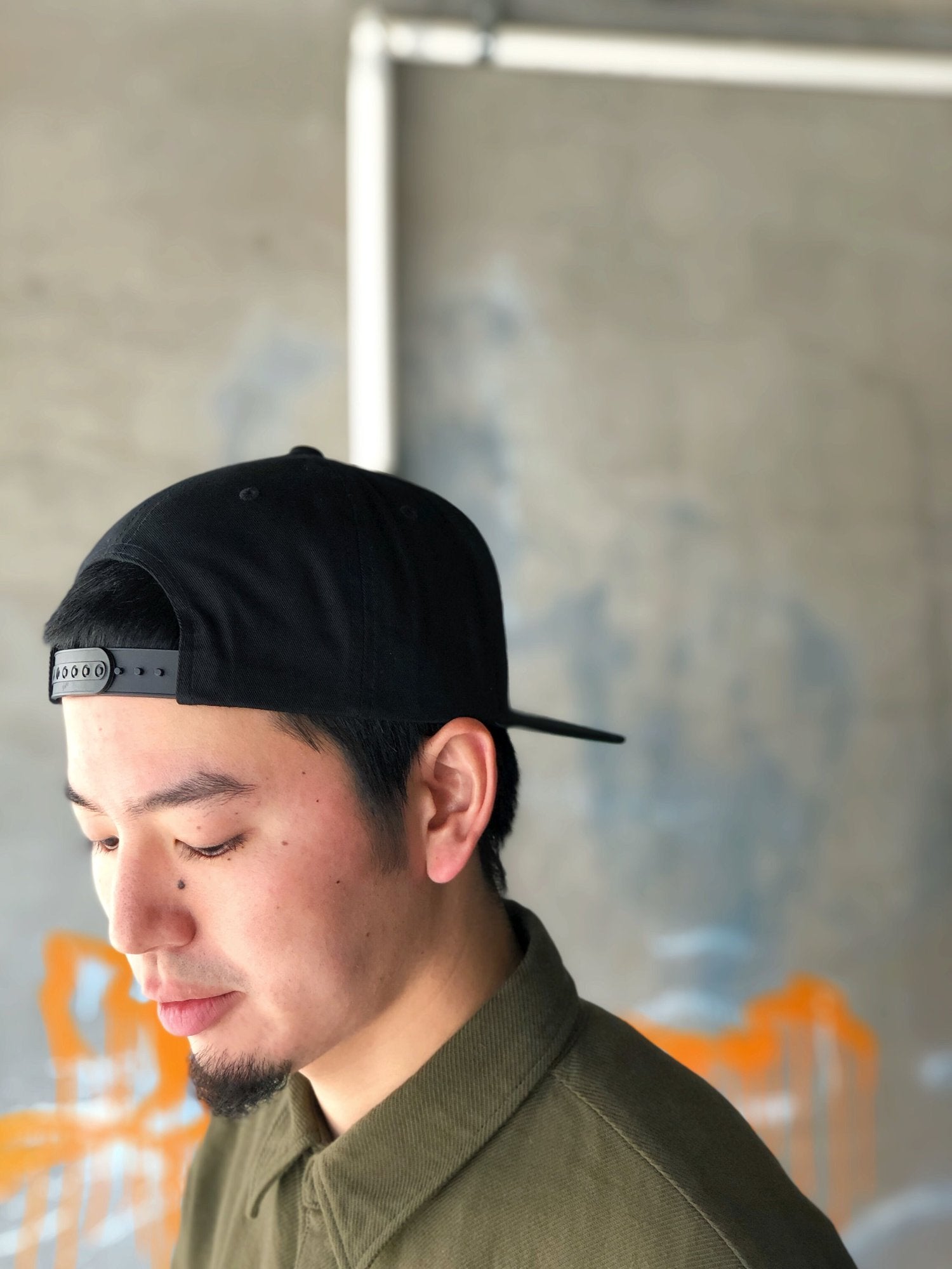 ツバ裏がグリーンのコットン100%・5パネルスナップバックキャップ。