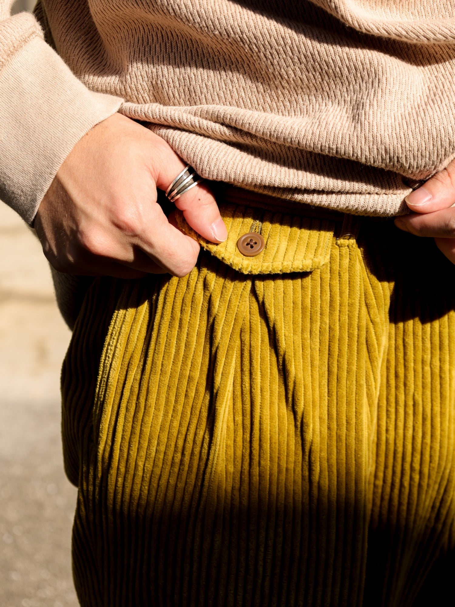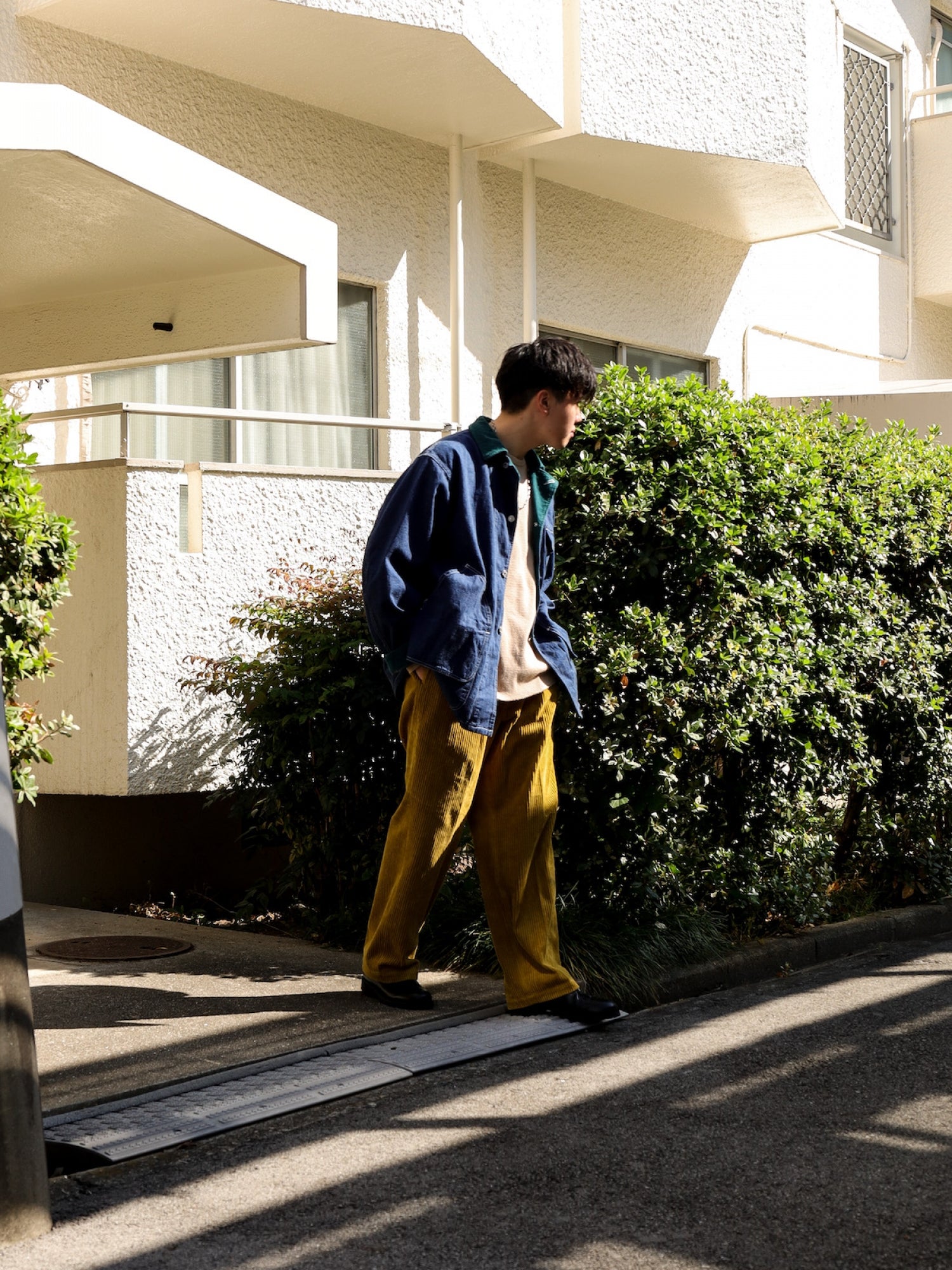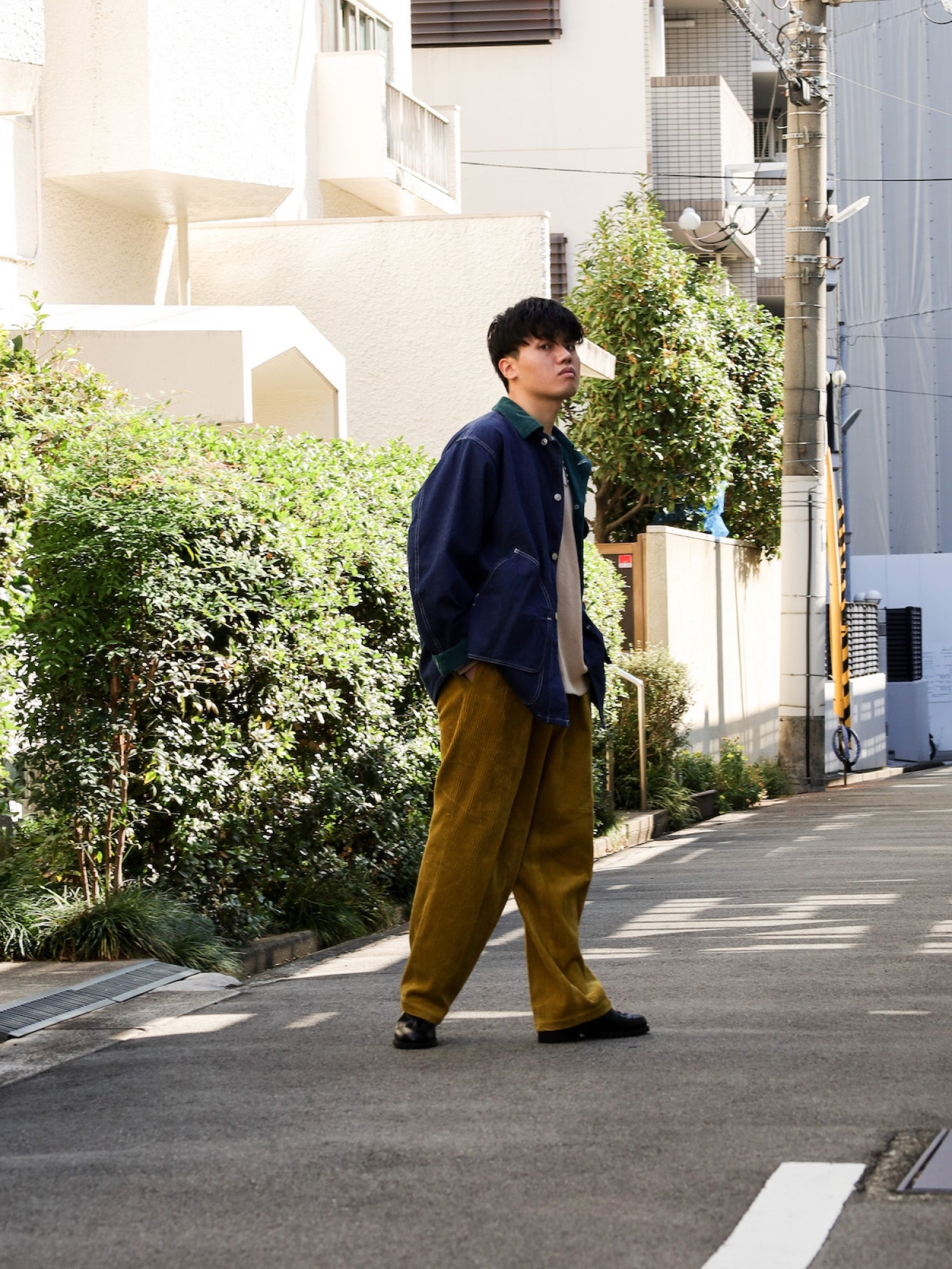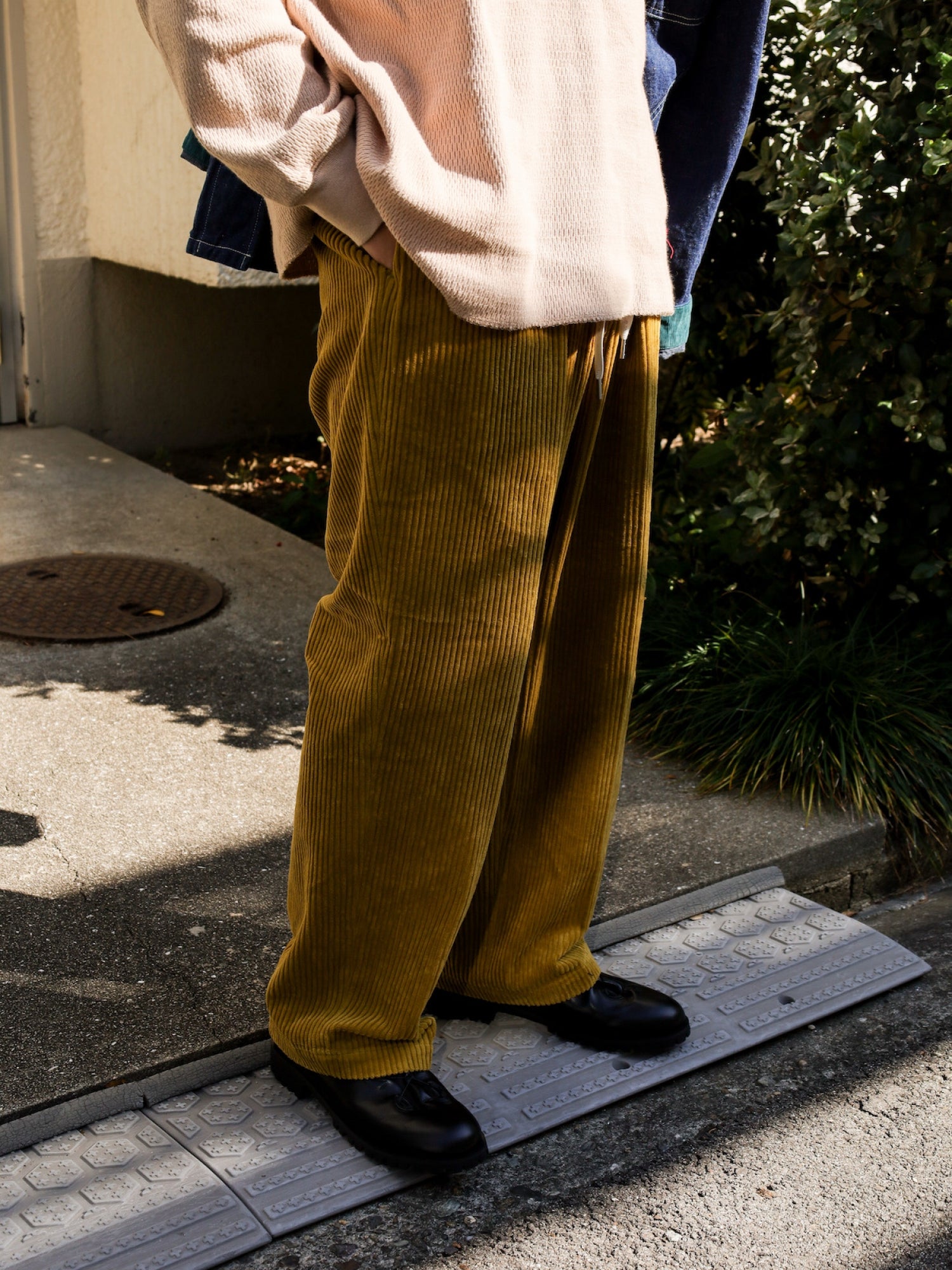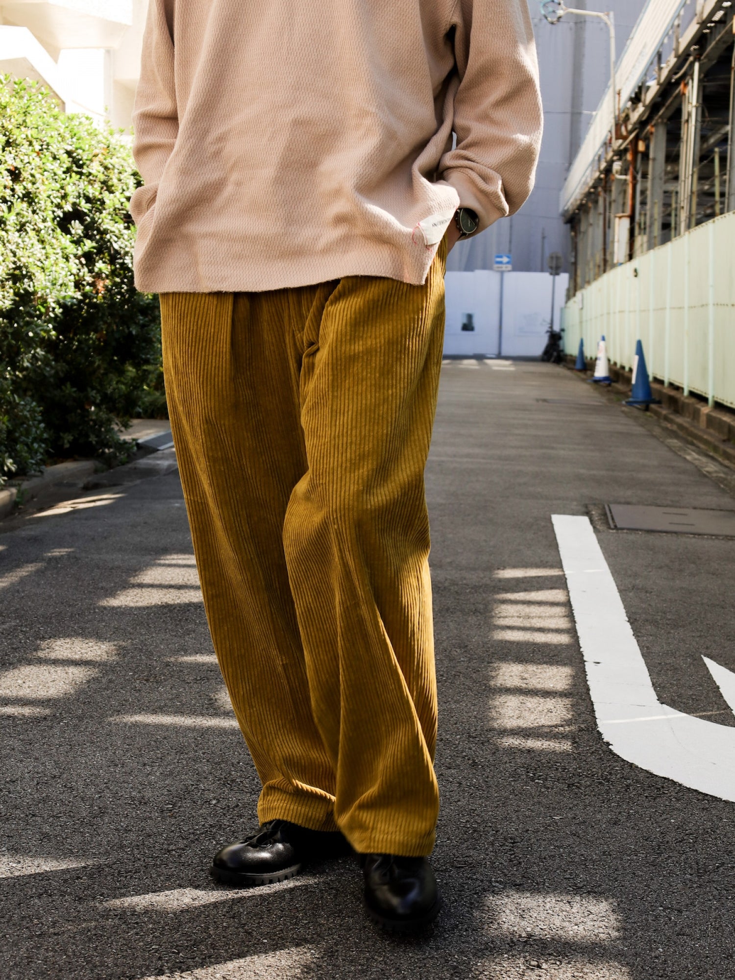 存在感のある太コール素材は秋冬の重みのあるトップスとの相性がよく、様々なスタイリングにハマる優れもの。